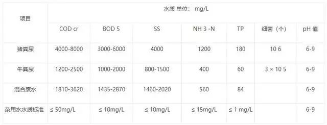 以山西省某市要新建一座豬、牛養(yǎng)殖場為例,該養(yǎng)殖場規(guī)模為:年養(yǎng)豬3000頭,養(yǎng)牛2000頭。廢水水量為1500m3/d,水質(zhì)見下表,處理水要求達(dá)到《雜用水水質(zhì)標(biāo)準(zhǔn)》(CJ 25.1-89)。