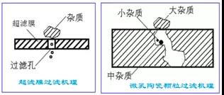 這是過濾截留原理示意圖,左圖表示超濾由固定孔徑機械截留,截留的雜質在表面堆積,小于孔徑的雜質會透過膜,液體的過濾路徑只有0.1微米。